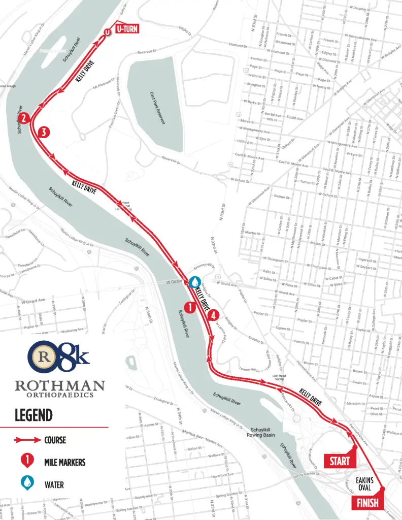 The Rothman Orthopaedics 8K (4.97 miles) is a fantastic way to take part in the race weekend excitement and follows the scenic banks of the Schuylkill River and Kelly Drive.